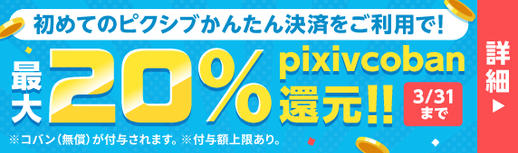 | 特典 | 「ピクシブかんたん決済 powered by みんなの銀行」の初回利用から翌月末までのお支払い額の10%(上限1,000円相当)のpixivcobanを付与 |