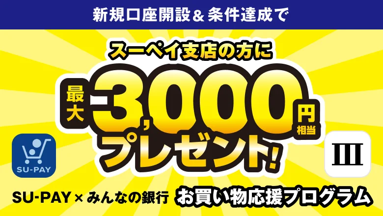 - 本プログラムはみんなの銀行の口座をお持ちでない方向けのスーペイ支店限定のプログラムとなります。