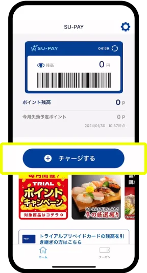 特典2のチャージに加え、さらに1万円以上をSU-PAYアプリへチャージでトライアルポイント1,000円相当プレゼント