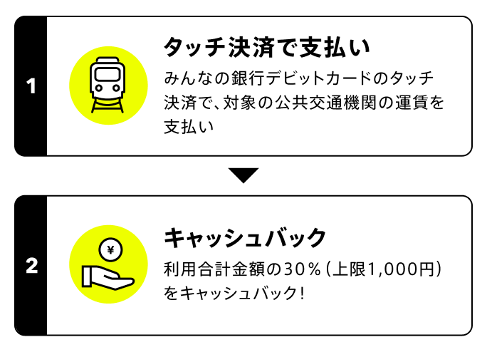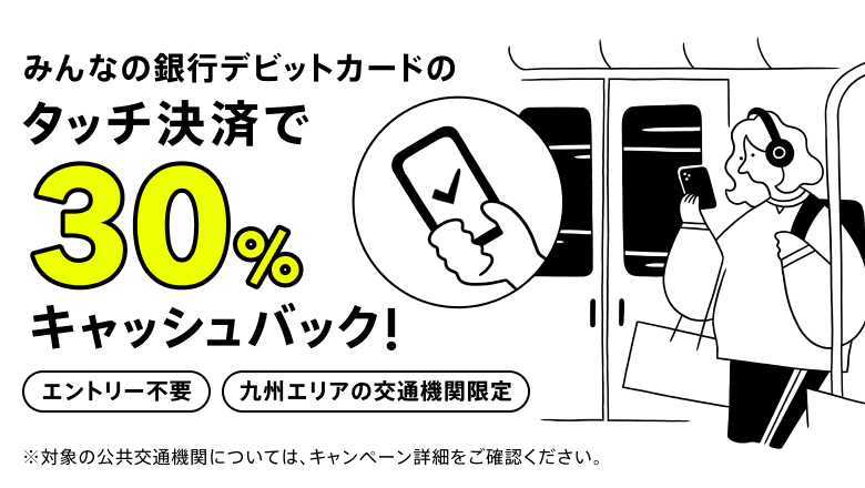 期間中、みんなの銀行デビットカードのタッチ決済で、対象の公共交通機関の運賃を支払うと、もれなく利用合計金額の30%(上限1,000円)をキャッシュバック!