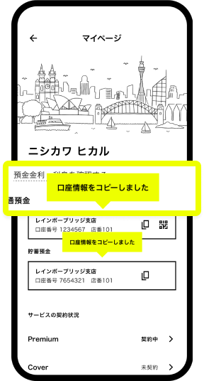 デビットカードを利用する前に、口座情報を確認して、みんなの銀行に入金しましょう。