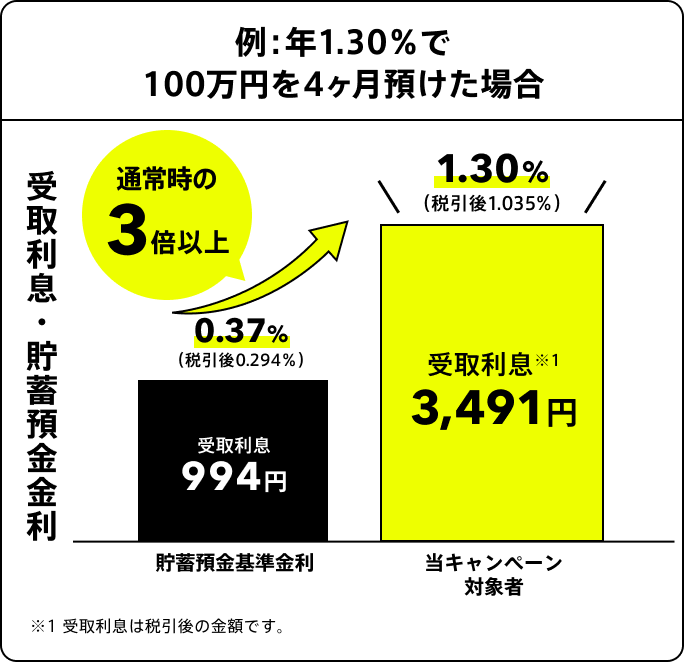 口座開設したその日から、4ヶ月間貯蓄預金(Savingおよびボックス)の残高100万円を上限に年1.30%(税引後1.035%)、プレミアム会員年1.50%(税引後1.195%)を適用
