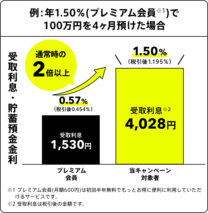 - 特別金利は、プレミアム会員は0.57%に0.93%を上乗せし1.50%(税引後1.195%)、プレミアム会員以外の方は0.37%に0.93%を上乗せし1.3% (税引後1.035%)になります(2025年12月15日時点)。ただし、上記の基準金利は、市場金利情勢などにより変更になる場合がございます。特別金利適用中に基準金利が変動した場合、本キャンペーンの上乗せ金利は、金利がプレミアム会員1.50%(税引後1.195%)、プレミアム会員以外の方は1.3% (税引後1.035%)となるように調整いたします。