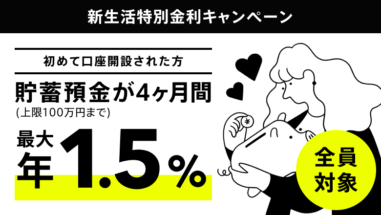 初めての口座開設の方は全員対象!貯蓄預金(上限100万円)が、4ヶ月間ずっと特別金利に。