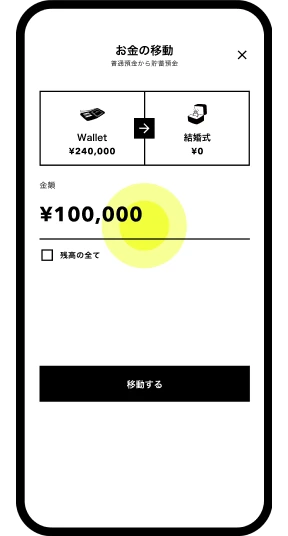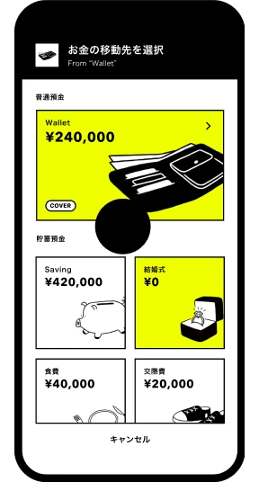 「結婚式」「新生活」など、貯めたい目的に合わせて仮想の箱を作成でき、必要な金額をドラッグ&ドロップで直感的に移動できます。計画的なお金の移動も自動でできるため、ふたりの将来の貯蓄にもおすすめです。