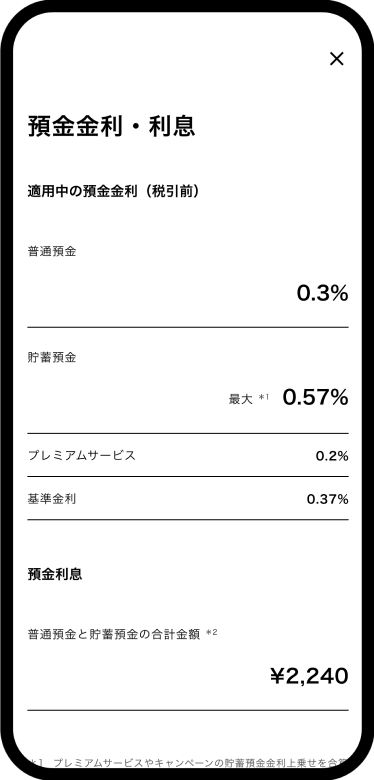 金利は通常でも0.37%、プレミアム会員なら0.57%と、業界でも高水準を誇ります※1,2。ただ預けておくだけでも、効率よくお金を増やせます。アプリから24時間365日いつでもお金を移動できるので、急にお金が必要になったときも安心。忙しい人でも、手軽に賢く貯蓄を始められます。