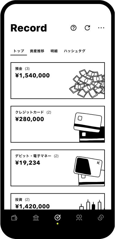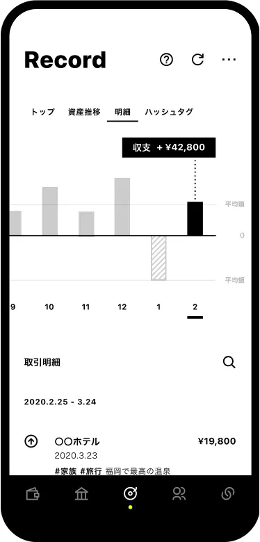 「レコード」機能を使えば、ほかの銀行や証券口座などとも連携することで、分散しがちな資産や支出の情報を1つにまとめて表示できます。また、毎月の収支や明細も確認できるから使い過ぎもかんたんに把握できます。