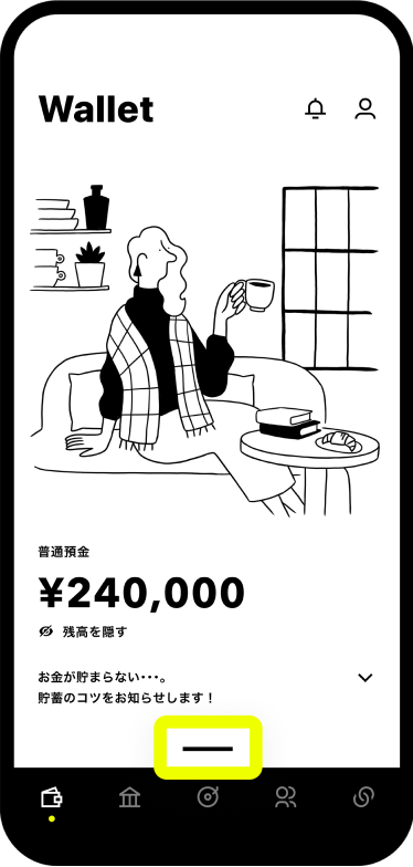 「Wallet」画面の下部にあるバーをタップし、「Action」画面をひらいてください。
