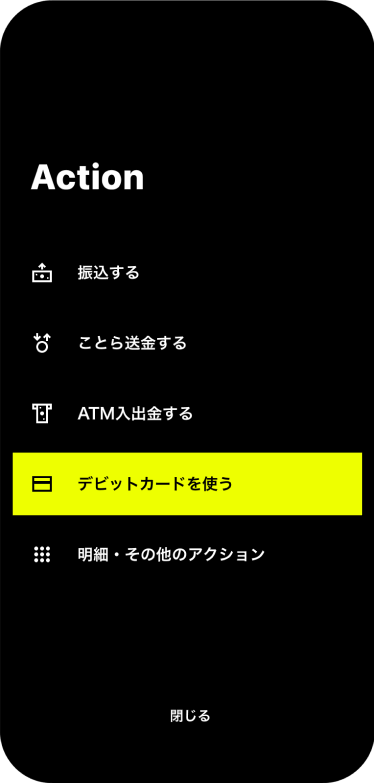 「Action」画面の「デビットカードを使う」をタップしてください。