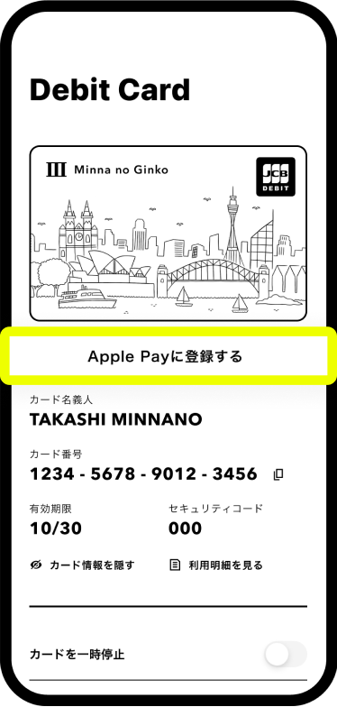 まずは、みんなの銀行デビットをApple Payや Google Pay に登録します。メインカードに設定しておくと、支払いの際に、みんなの銀行デビットカードが自動選択されるため便利です。