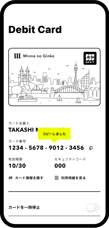 長押しでカード名義人・カード番号・セキュリティコードなどをコピーできます。