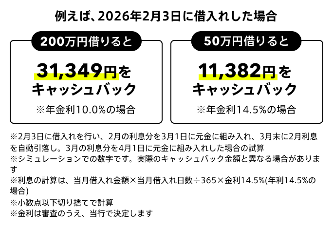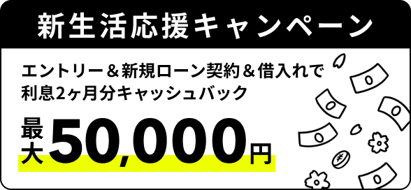 エントリーかつはじめての契約、借入れで、契約月と翌月の利息2ヶ月分を最大50,000円キャッシュバック