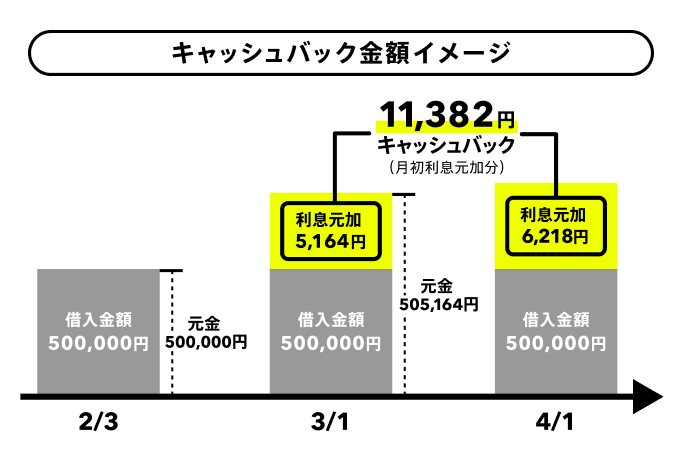 - 3月契約の場合、3月分(4/1利息元加)、4月分(5/1利息元加)の利息がキャッシュバックの対象になります。