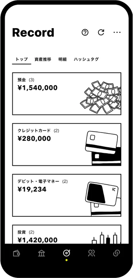 すべての収支を見える化できるため、貯蓄と家計管理のどちらも効率的に進めたいと考えている方に最適です。加えて、レコード機能では連携した総資産の推移や毎月の収支をグラフでわかりやすく把握できる点も強みです。