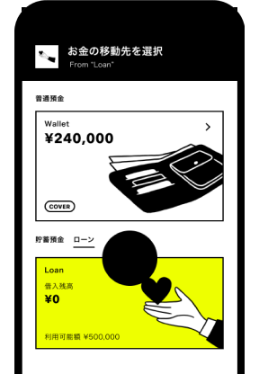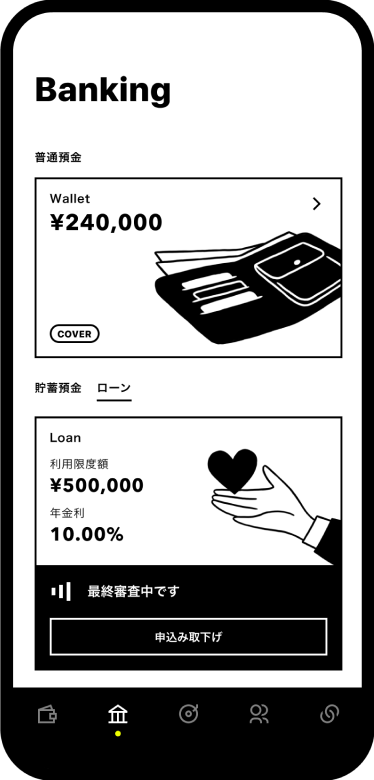 「Banking」画面で「ローン」をタップし、ドラック&ドロップでローンから普通預金へ移動、借入金額入力画面に遷移します。